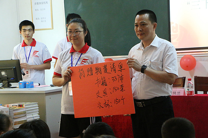 伴随着庄严的国歌,开班仪式缓缓拉开了帷幕。温东保对服务队的到来表示热烈的欢迎和深切的问候,对服务队的工作给予了高度肯定,同时也对小学生们提出要求,希望学生们珍惜本次难得的机会,并预祝活动圆满成功。钟金发对龙村镇、登畲村以及第三小学个有关部门对本次活动的支持与关怀表示衷心的感谢,并介绍了服务队的概况及各项活动的安排。在队长周莹的带领下,全体服务队队员进行宣誓,表明大家圆满完成任务的态度和决心,承诺将严守规定,为三下乡社会实践活动贡献自己的力量。本次服务队共向龙村镇第三小学捐赠书籍337本,文具150套,水杯150个,鼓励小学生们努力学习,报效祖国。