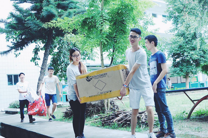 经过近半个月的准备,7月10日上午,艺希之晨筑梦服务队指导老师钟金发和邝欣,带领着32名学生,冒着阵雨向梅州市五华县龙村镇第三小学进发,艺术设计学院的三下乡社会实践活动正式开始。虽然天下着雨,但是并没有影响到师生们激动的心情。大家一路且歌且行,经过近4个小时的车程到达目的地。由于大巴无法驶入,服务队队员们集体下车,徒步将捐赠的图书、教学用品和宣传用品等几十种物资搬运到学校,大家的满面笑容使原本静悄悄的校园顿时充满了活力。