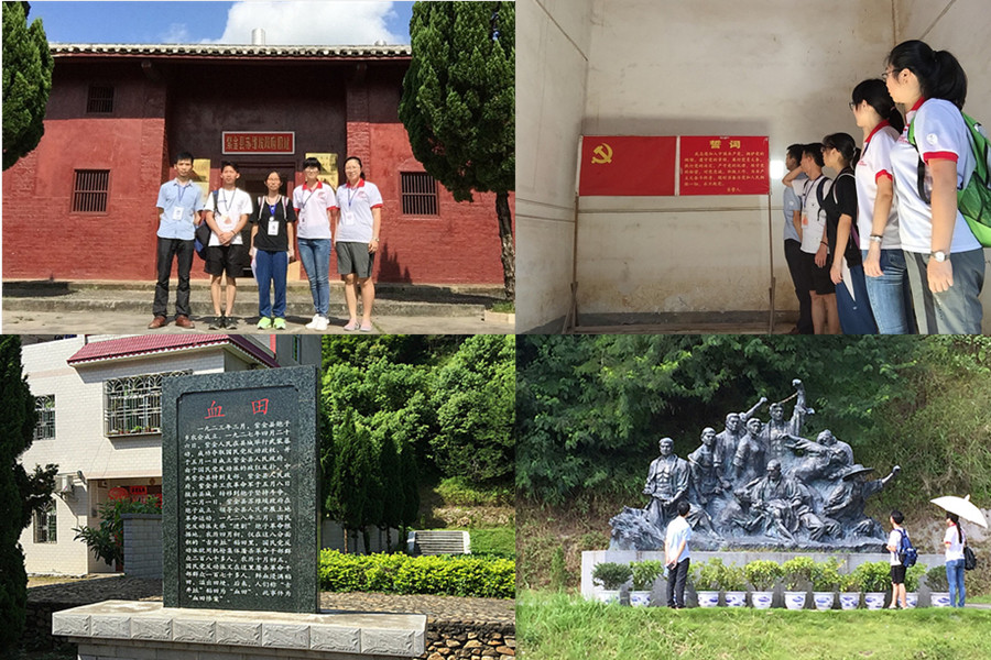 有两处革命遗址给服务队留下了深刻的印象。第一处是紫金县苏维埃政府旧址。这栋建筑原本是清代大地主黄振云的粮仓,在1923年3月后成为紫金县总农会、农民协会机关办公的地方,随着农民运动的开展,1927年12月成为了紫金县第一个红色政权——紫金县苏维埃政府的办公地。第二次革命战争时期,整座房屋外墙被刷成红色,被称之为“红屋”。队员们在红屋里,面对党旗重温了入党誓词。第二处,便是著名的 “血田”。 1928年农历4月和10月,国民党反动派在这块不足一亩的稻田上两次枪杀共产党员和革命群众共450多人,鲜血染红了整块稻田,造成了惨绝人寰的“血田”惨案。“血田”简介深深震撼了队员们,大家纷纷走到纪念碑前缅怀革命先烈。除了参观建筑物和实地考察革命遗址,队员们还去展览馆系统了解当地革命历史的发展进程。在三层楼的展厅里,队员们被一幅幅图片、一件件实物、一个个故事所感动,心灵再次受到革命精神的洗礼。