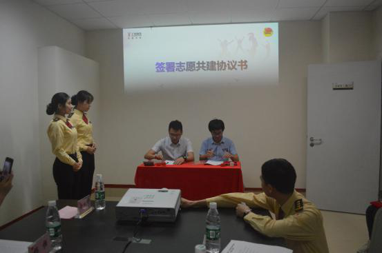 双方随后签署了共建协议书,由何柏略和周小南共同为志愿共建基地揭牌,并由杨恒为我校团委授旗。