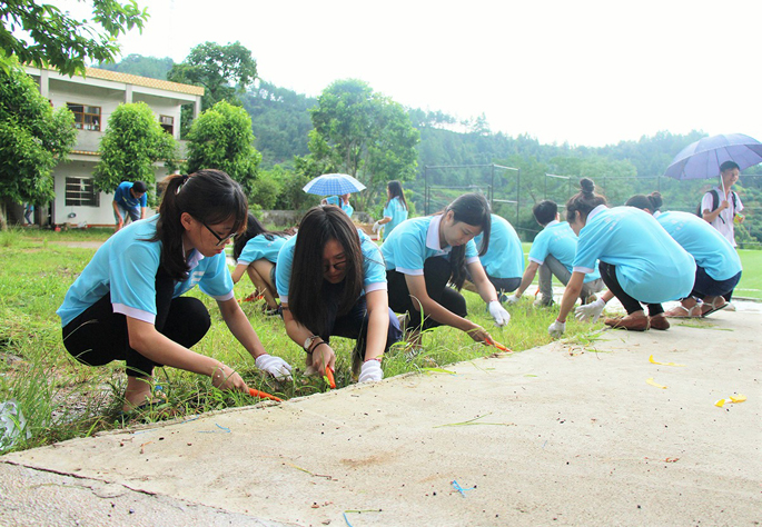 下午的支教课堂结束后,谭小龙便带领全体队员做务农的准备。队员们携带着手套和小镰刀,向长满杂草的草坪中走去。也许队员们的动作不是那么熟练,但是大家相互鼓励,很快便全情投入到除草工作当中。野草生长得杂乱无章且有的叶片很锋利,即使有手套的保护也免不了划伤队员们的手,然而这并没有阻挡队员们清理杂草的脚步。务农活动持续了近一个小时。活动结束后,队员们都大汗淋漓,但看着那变得开阔的校园场地,大家内心的满足和自豪溢于言表。即使除草务农的时间较为短暂,但服务队为桃源小学的美丽贡献了自己的一份力量,同时也让队员们体会到劳动的艰辛。