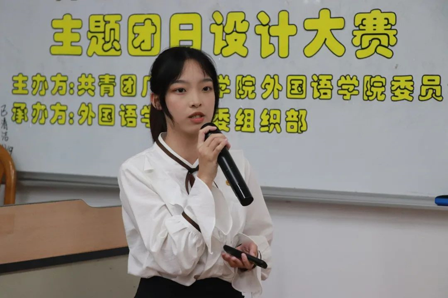 为贯彻落实“灯塔工程——广东青年大学生思想引领行动”统一部署,学习党的十九届六中全会讲话精神,进一步了解党的百年奋斗历史。外国语学院团委于12月9日19:00在三教105举行了外国语学院2021-2022学年“青春向党·奋斗强国”主题团日设计大赛,出席本次大赛的嘉宾有外国语学院团委书记蔡文蝶及学生会指导老师何沛瑾。