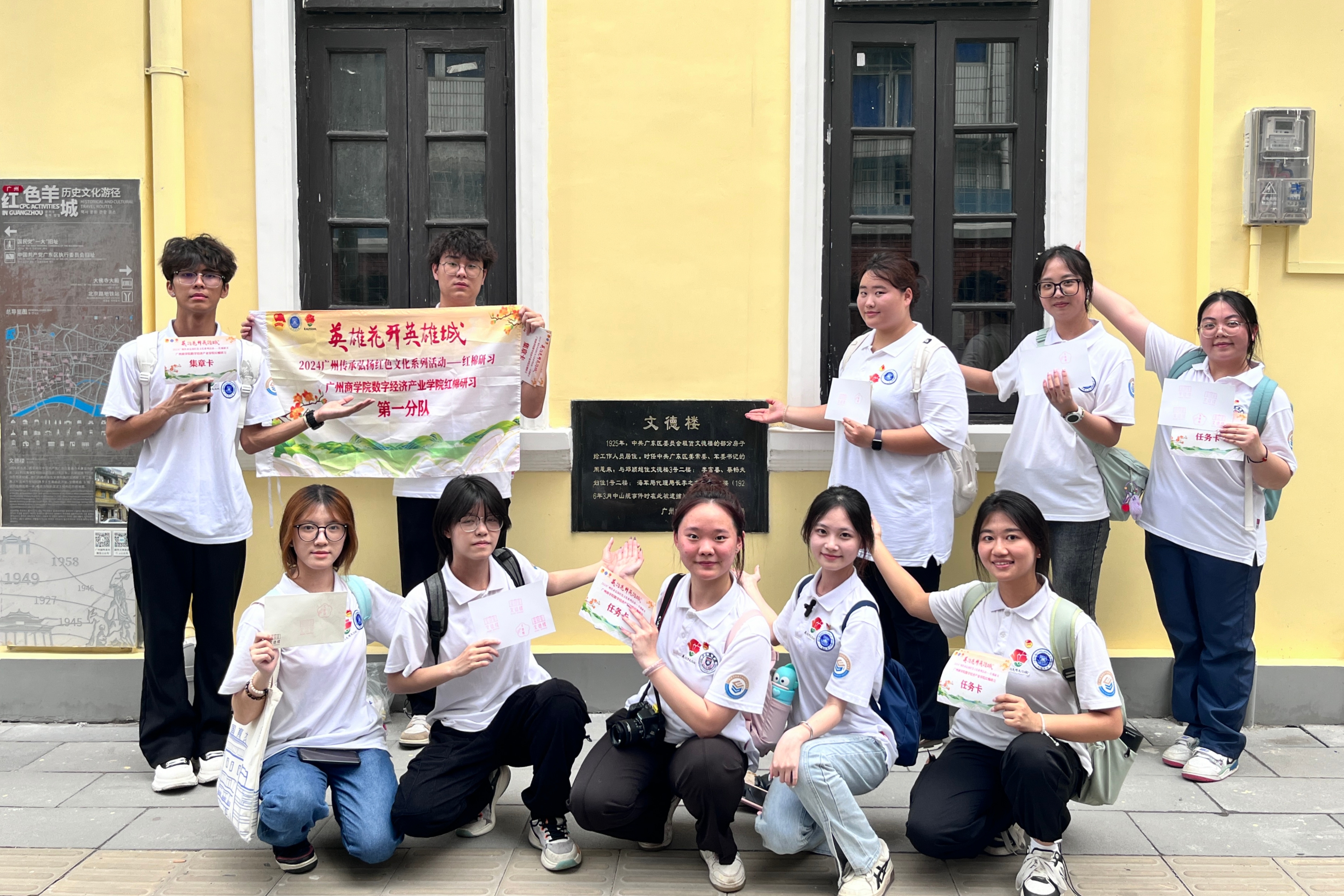 第二小队依次探访周总理视察岑村旧址、太平馆、中共两广区委军委及广东区委执行委员会旧址,和第一小队相互配合,追寻周恩来的广州足迹。他们通过绘蓝图、拼图、猜成语等活动,体悟周恩来总理波澜壮阔的革命故事,队员们回望一代伟人的革命足迹,不仅深刻感受到了周恩来总理的人格魅力和精神风貌,更从革命先辈中不断汲取革命精神,凝聚起新时代青年的奋进力量。