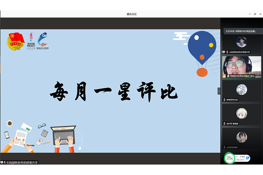 为加强部门之间工作进度的了解,汇报本月各部门工作情况,总结本月工作中存在的优缺点,并对下个月工作进行具体的规划,信息技术与工程学院团委于5月27日晚通过腾讯会议app开展信息技术与工程学院五月份团委例会。出席本次活动的嘉宾有信息学院团委书记兼20级辅导员陈钰纯,本次会议由团委秘书处马豪杰主持。
