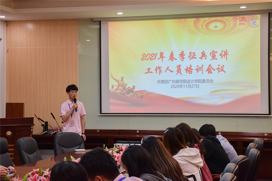 在此前,为更好的明确各团委成员的职责,保障本次宣讲会的有序进行,会计学院团委于11月27日在第二行政楼208室开展2021年春季征兵宣讲工作人员培训会。会上,实践部副部长黎沛豪向大家讲解了此次宣讲会的流程及注意事项,并对大家提出的疑问进行解答,确保宣讲工作顺利开展。最后由会计学院团委书记谢桉琦进行总结。