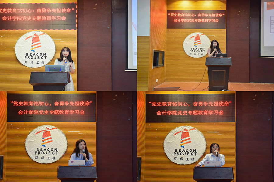 会计学院团委书记谢桉琦在开讲仪式中指出开展党史学习会的三点目的:一是在中国共产党百年华诞的重大时刻和两个奋斗一百年历史交汇点的关键节点,注重用党的奋斗历程和伟大成就鼓舞斗志、明确方向;二是学史明理,用党的光荣传统和优良作风坚定信念、凝聚力量;三是学史明鉴,全方位学习党史,挖掘中国共产党人的精神,培育高尚品德,做到学党史、悟思想、伴史志、开新局。她希望大家能够在学习会中有所成长、有所感悟,做社会主义的接班人,为建设美好祖国作出自己的贡献。