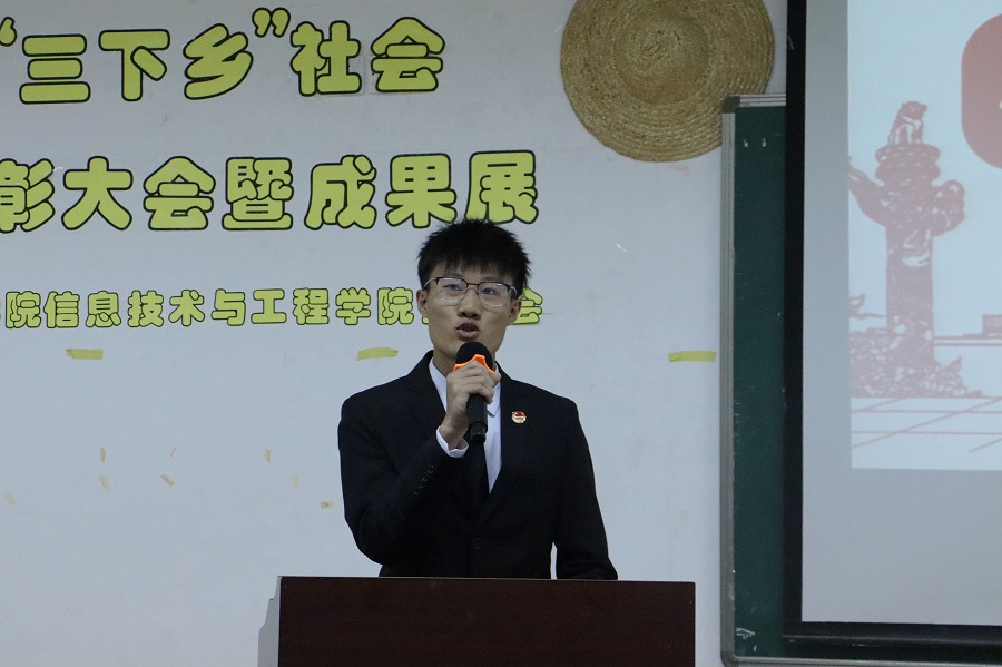 大会伊始,关俊明书记在视频中说到,大学生暑期“三下乡”社会实践是促进大学生整体素质的发展,是学生接触社会、了解社会、服务社会,培养实践能力和交际能力的一个重要途径。他期望学生们能把学习党史与现实结合起来,培育和践行社会主义核心价值观,学习红色精神,传承红色基因。随后,优秀个人代表李奕龙发言,他讲到,“三下乡”社会实践是让学生在社会大熔炉里接受锻炼、经历考验、增长才干、开阔眼界,在农村基层中展现风采、奉献智慧、贡献力量的一个不可多得的机会。他希望同学们能踊跃参与三下乡活动,在经历中收获不一样的自我。紧接着,三下乡服务队代表展示活动成果,获得“优秀团队奖”的是 “e启逐梦”三下乡服务队、红心筑我乡队,青春助农行团队、红潮队、逐梦者队。大会尾声,姜灵敏院长作大会总结,他希望通过这次活动,能锻炼同学们的情商,提高团队精神,培养数字思维,学会换位思考、宽容待人,带领更多学生积极参与三下乡活动,成就更好的自我。