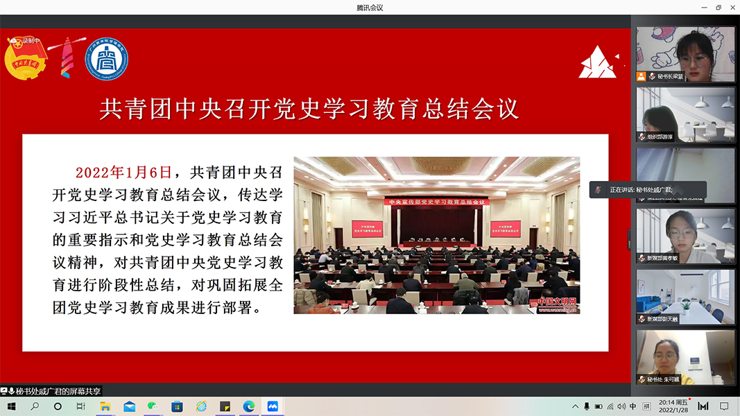 为深入学习贯彻共青团中央党史学习教育总结会议精神,不断巩固拓展党史学习教育成果。1月28日晚,管理学院团委于腾讯会议组织团委全体工作人员开展共青团中央党史学习教育总结会议精神专题学习会暨百年循迹第十二讲,参与本次会议的有团委书记李俞妍及管理学院团委全体成员。