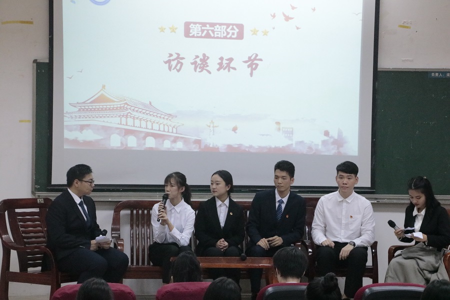 活动在全体师生奏唱团歌中拉开帷幕。通过回顾视频,带领大家回顾了21级新生入学后的点点滴滴以及军训时的酸甜苦辣。陈海坛结合自己入党的经历,围绕“眼中的共产党”、“为什么入党”和“我是共产党员”三个方面进行分享;赵棚分享了在各种专业竞赛中取得的经验,从勇敢、责任、努力和成长四个方面阐述了如何成为一个强大的人;吴沁遥分享了作为一名学生干部的工作经历,鼓励新生们在大学生活里应多尝试,践真知;丁泳曦从自身的志愿者经历出发,激励新生们做追光者,也要做造梦者。在互动环节中,师兄师姐们带领同学们开启“寻宝”之旅,同学们聆听着党史故事,更深层次地了解历史,尊重历史和铭记历史。在访谈环节中,四位师兄师姐为在场的同学解疑答惑并提供了诸多建议和启迪。