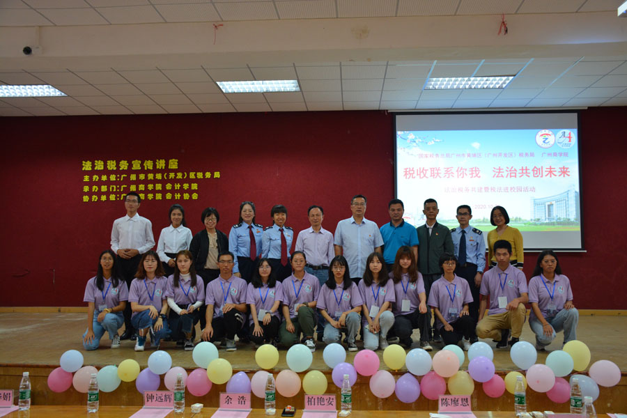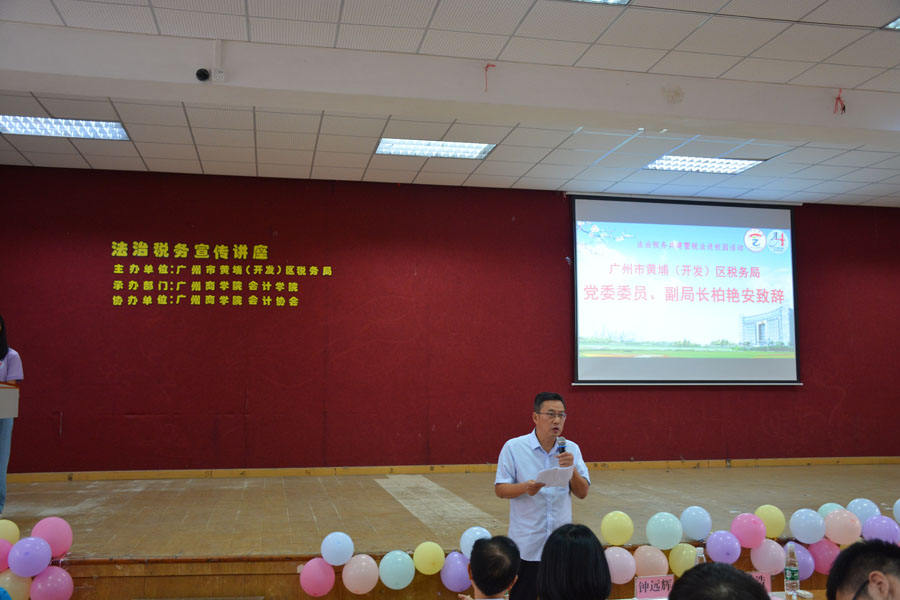 为了宣传税法和税收优惠政策,加强对大学生的税法教育,广州市黄埔区(开发区)税务局携手suncitygroup太阳集团于2020年10月29日下午14点在一教206教室举办法治税务宣传讲座。出席本次活动的有广州市黄埔区(开发区)税务局副局长柏艳安,广州市黄埔区(开发区)税务局法制科科长陈廖恩,广州市黄埔区(开发区)税务局九龙税所副所长华武,会计学院院长余浩,会计学院党总支书记钟远辉,税务局老师刘珏、彭茵等嘉宾以及suncitygroup太阳集团会计学院学生。