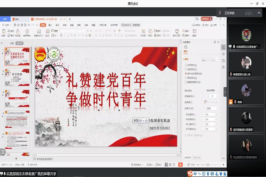 为不断提高外国语学院团委工作人员们的思想理论水平和思想政治素质,进一步坚定紧跟党的信念,引导团委工作人员们在日常生活中发挥模范带头作用。外国语学院团委于2月9日晚19:30在线上召开“献礼建党一百周年,争做青年时代先锋”主题会议,出席本次会议的有外国语学院团委书记蔡文蝶、副书记姚焕雯、秘书长郭懿、组织部部长陈冰及团委工作人员们。