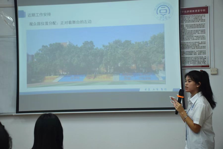 各学院宣传部代表根据学校工作安排,结合学院实际情况对本学期宣传部主要工作进行汇报分享交流,从工作目标、工作计划、工作方法、特色活动等方面进行分享。紧接着,校学生会宣传部工作人员柯依敏向大家介绍了本学期学校宣传主要工作要点,在宣传栏的更新、固定志愿者培训、特色活动等方面进行详细讲解,同时对近期校运会筹备工作进行具体安排和分工。