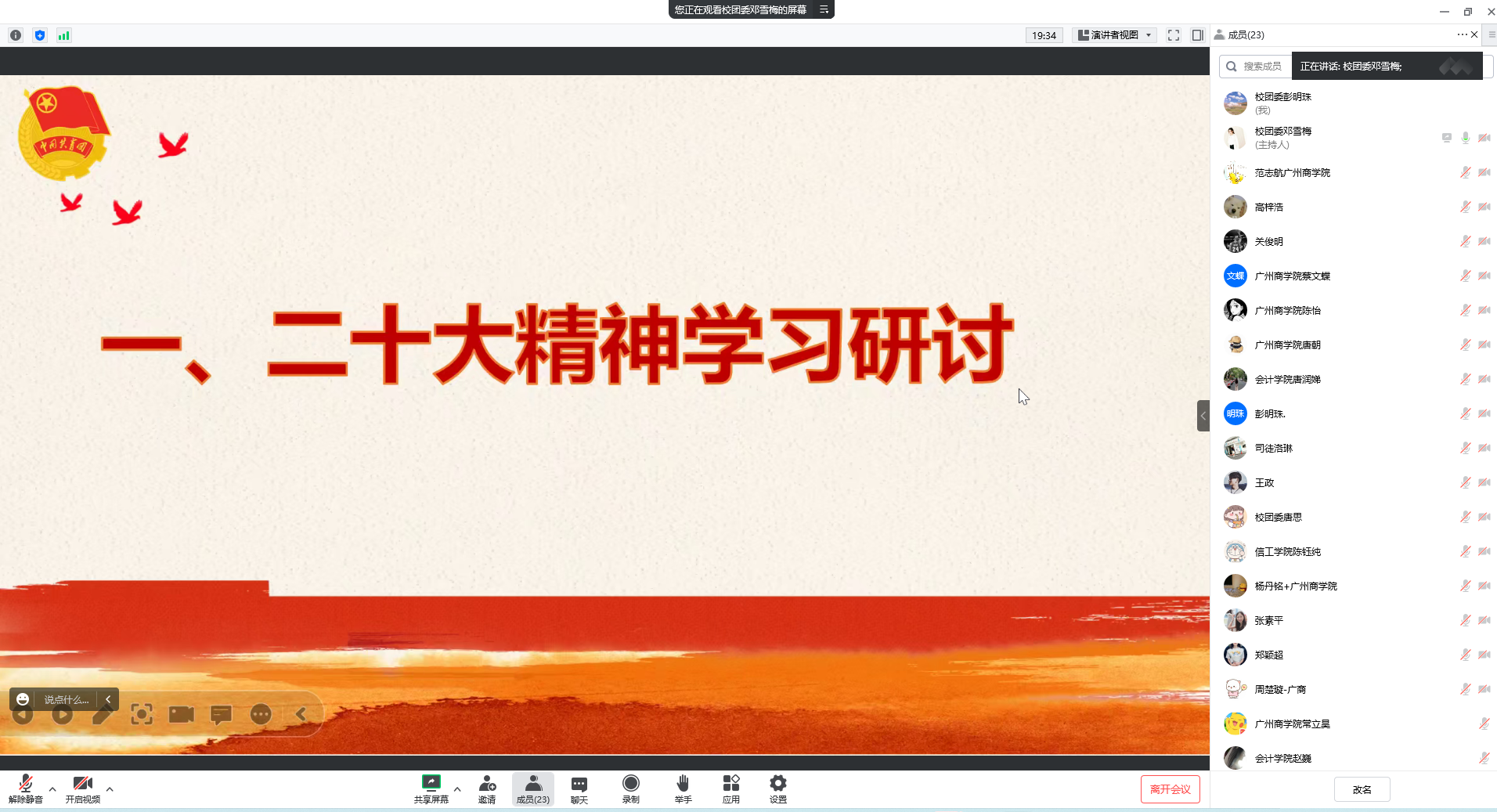 专职团干邓雪梅老师根据《关于做好2022-2023年岁末年初团的基层建设有关工作的通知》《关于开展广东高校共青团改革评价的工作提示》及学校近期工作安排,就我校共青团工作12月份重点工作进行详解,对“百团百歌颂百年”红歌传唱,志愿月活动以及新媒体达人赛等活动作了具体安排和推进。