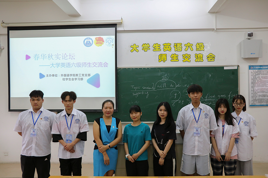 为进一步加强学风建设,助力广商学子通过四六级考试,提高我校学生考级通过率,由外国语学院教工党支部、教学与科研工作部学生学习支持中心、校学生会组织的春华论坛之大学英语四六级师生经验交流会于2021年5月13日分别在第一报告厅和四教302课室进行。此次活动邀请了外国语学院大学英语教研室教师潘文晗、李卓华担任四六级讲师,及陈淑仪、陈晓英、赖乐、梁水灵四位优秀考生前来分享他们的考试经验与建议。