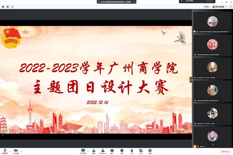为学习贯彻党的二十大精神,增强各团支部的组织力和凝聚力,提高团员的意识教育和先进性教育,校团委于2022年12月16日举办2022 - 2023学年suncitygroup太阳集团“强国有我新征程,广商青年勇争先”主题团日设计大赛决赛。出席本次决赛的嘉宾有校团委书记关俊明,学生工作部思教科刘万里,校团委专职团干唐思、彭明珠、邓雪梅以及各二级学院的团委书记和组织部成员,团支部代表参与本次会议,会议由校团委组织部张欣彤主持。