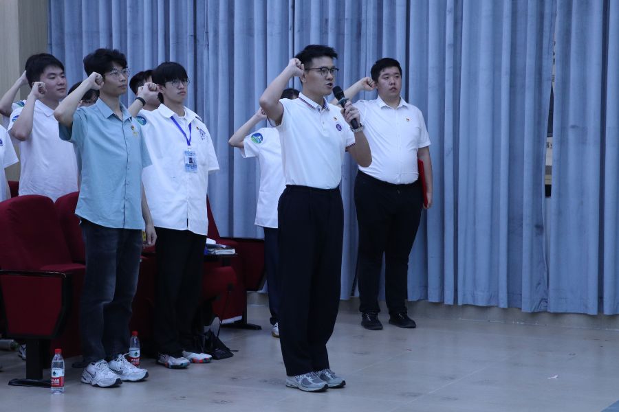 关俊明为15支校级重点团队和17支校级培育团队授旗。并由2023年暑期社会实践省级优秀个人代表王政老师带领2024年暑期社会实践全体师生进行宣誓。