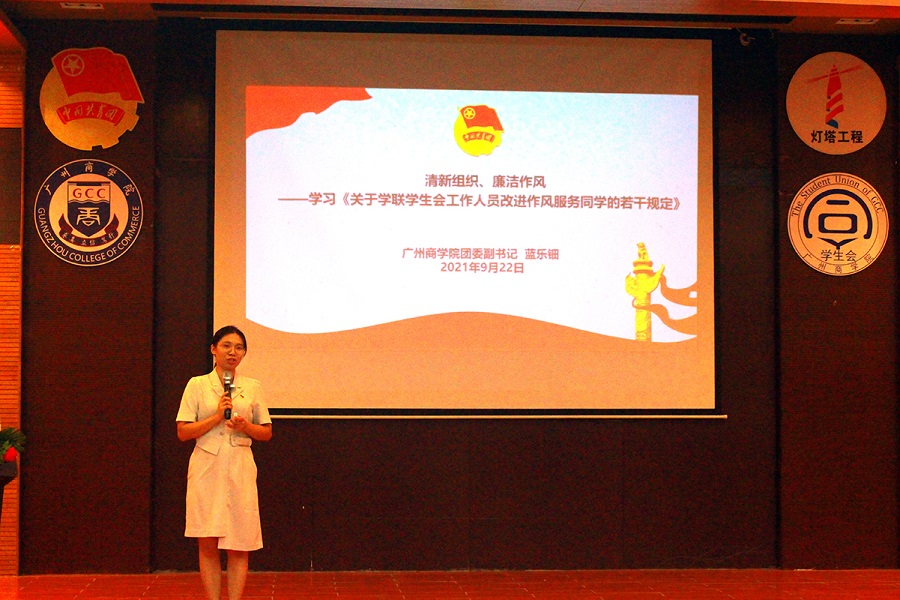 为深入学习《关于学联学生会工作人员改进作风服务同学的若干规定》,建设风气清新的学生组织,培养廉洁的工作作风,塑造清新阳光的组织形象,2021-2022学年校院两级学生会工作人员培训于9月23日晚在第四教学楼第一报告厅举行。校团委副书记蓝乐钿、各二级学院学生会指导老师,以及校院两级学生会工作人员出席本次会议。